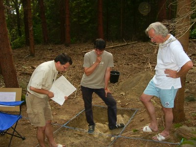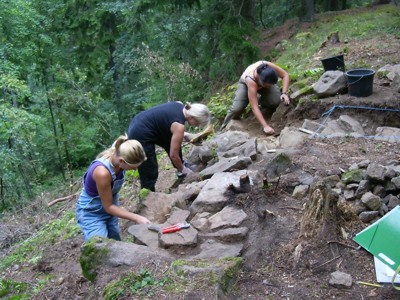 | Kerstin, Christine und Kristina bei der Freilegung eines noch sehr gut erhaltenen Mauerabschnittes im Nordturmbereich. | |