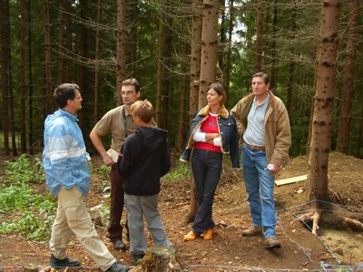 | Grabungsleiter Mag. Josef Engelmann und Projektinitiator Otto Ruhsam im Gespräch mit dem Landschaftsarchitekten Dipl.Ing. Dr. Alfred Benesch mit seiner Frau Doris und Sohn Sebastian. | |