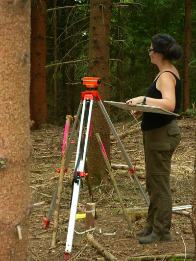 | die Archäologin Kristina Schlömicher beim Vermessen wichtiger Punkte | |