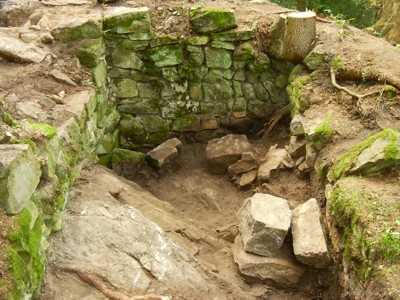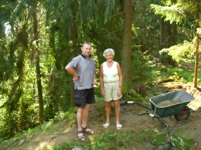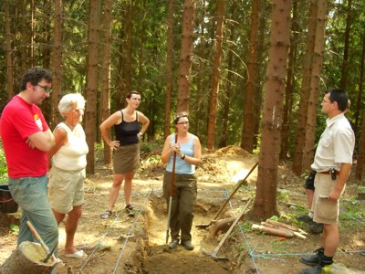 | Mag. Josef Engelmann (rechts) erklärt den GrabungskollegInnen und der Waldbesitzerin Sonja Erhart Details zum Suchschnitt. | |